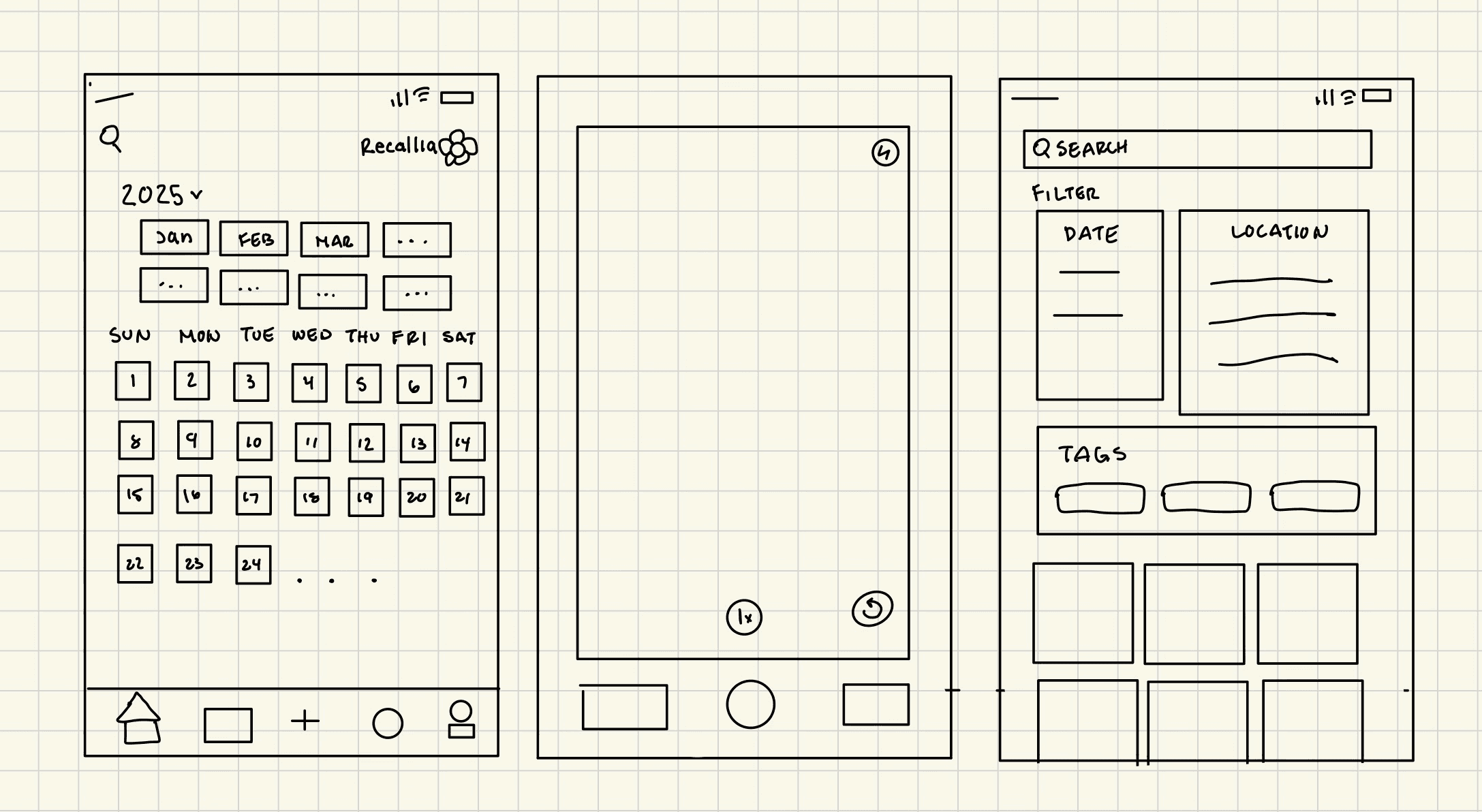Low-Fidelity sketches of the feature screens. Calendar view (left), taking moment (middle),
